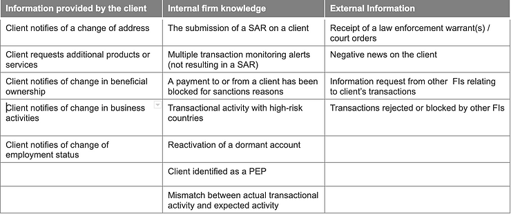 Such changes require the financial institution to revisit the due diligence undertaken on the client, understand whether the client’s risk profile has changed, and obtain further information where necessary to update the CDD:
